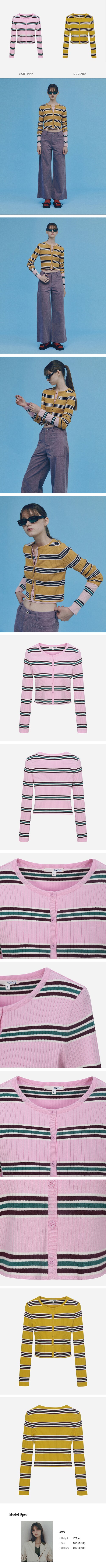 화사한 색감의 골지 스트라이프 가디건.얇은 두께와 신축성있는 원사를 사용해 단독으로도,두께감있는 아우터 안에 상의대용으로도 활용가능한 간절기 니트 아이템.