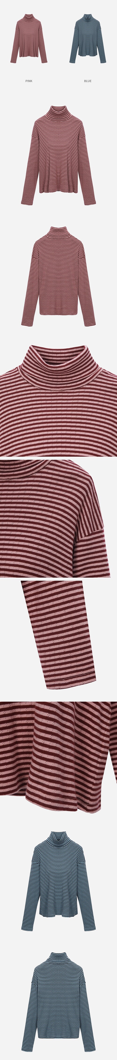 넉넉한 핏으로 다양하게 코디 가능한 터틀넥 티셔츠.스트라이프 원단을 사용하여 포인트를 준 스타일.
