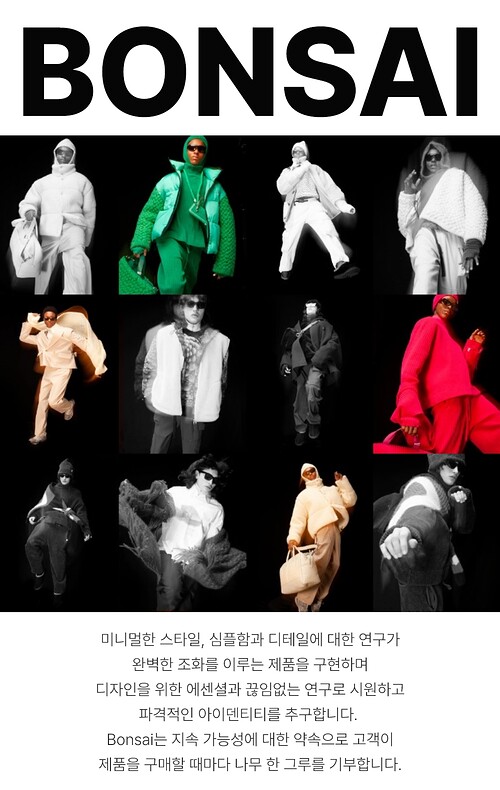 - BONSAI : 이탈리아를 기반으로 하는 일상에서 영감을 받은 원단과 과감하고 다채로운 패턴과 컬러에 대한 끊임없는 연구로 시원하고 파격적인 아이덴티티를 구체화시키는 것을 목표로 하는 브랜드. BONSAI 는 지속 가능성에 대한 약속으로 고객이 구매할 때마다 ZEROCO2와 협력하여 나무 한 그루를 기부하는 사회적 활동 지원에 기여 중.