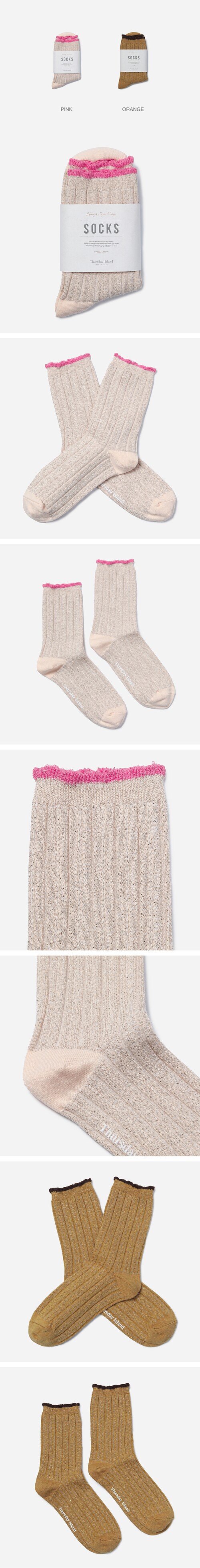 입체적인 케이블 조직과 메탈사가 어우러진 아이템.컬러 배색 끝단이 포인트인 로맨틱한 무드의 양말.