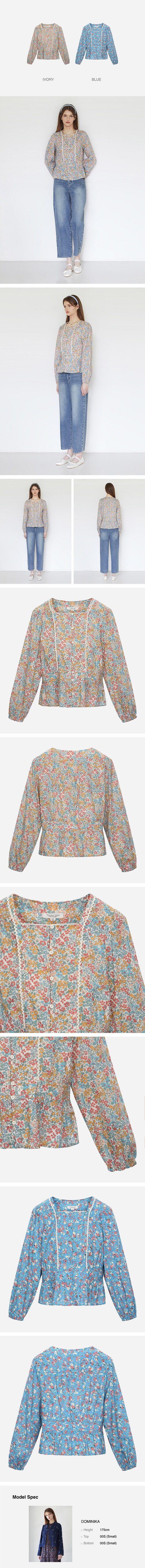 스퀘어 넥의 허리 밴딩 페플럼 블라우스로 배색레이스가 포인트인스타일.