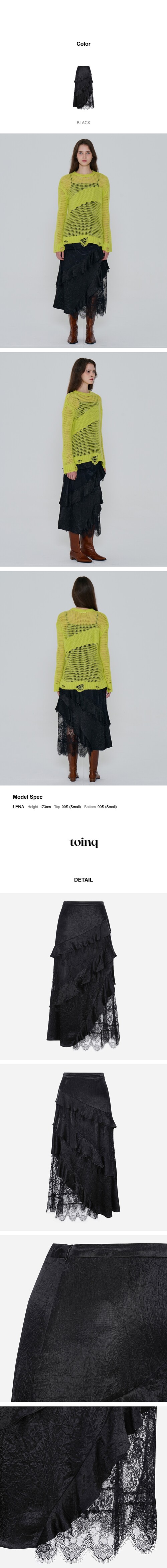 볼륨감 있는 프릴 맥시 스커트.와샤 포인트의 광택 폴리 원단과 레이스 원단을 믹스 매치한 스타일로, 프릴 단이 언발란스하게 떨어져 유니크한 무드를 주는 아이템.
