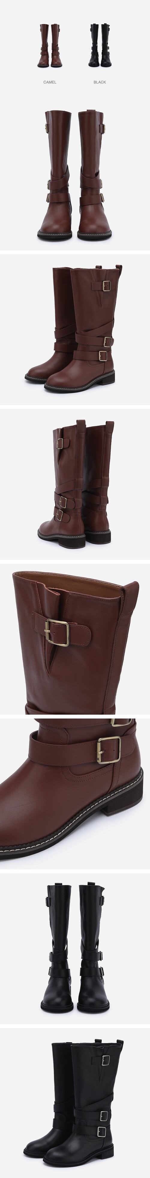 버클 스트랩과 핀턱 디테일로 포인트를 바이커 롱부츠.여유 있는 사이즈감과 가벼운 무게감으로 멋스럽게 활용하기 좋은 아이템.