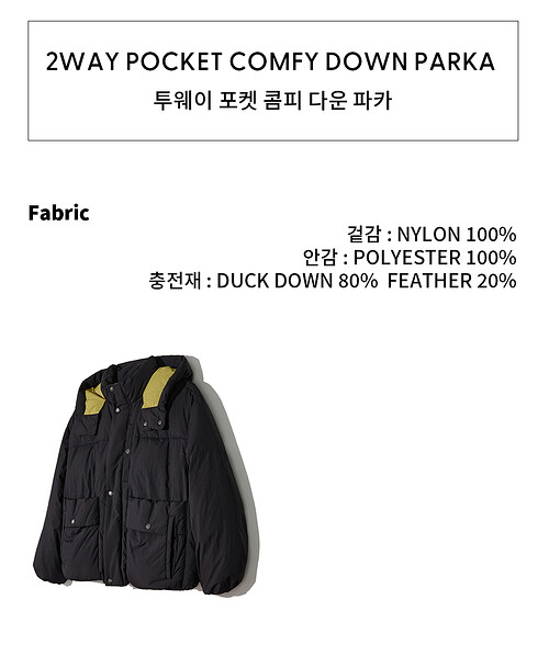 블랙 : 겉감 나일론100%, 배색 나일론100%, 안감 폴리에스터100%, 충전재 오리털(솜털)80%, 오리털(깃털)20% - 세탁방법 및 취급시 주의사항 다림질금지, 드라이크리닝, 물세탁금지