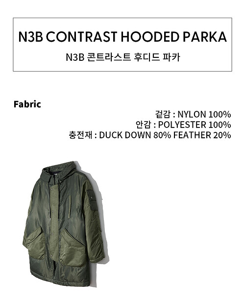 - 밀리터리 아이템인 N3B 파카를 두 가지 톤의 카키 컬러로 톤온톤 배색으로 구현한 논타입만의 감성으로 재해석한 헤비아우터