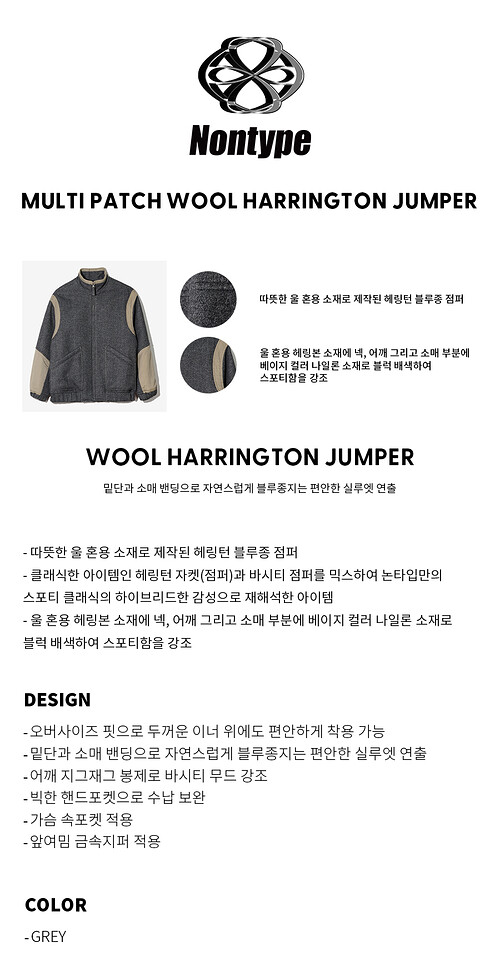 - 클래식한 아이템인 헤링턴 자켓(점퍼)과 바시티 점퍼를 믹스하여 논타입만의 하이브리드한 감성으로 재해석한 아이템