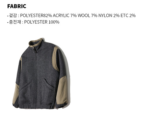 그레이 : 겉감 폴리에스터82%, 아크릴7%, 모7%, 나일론2%, 기타2%, 배색 나일론100%, 충전재 폴리에스터100% - 세탁방법 및 취급시 주의사항 다림질금지, 드라이크리닝, 물세탁금지