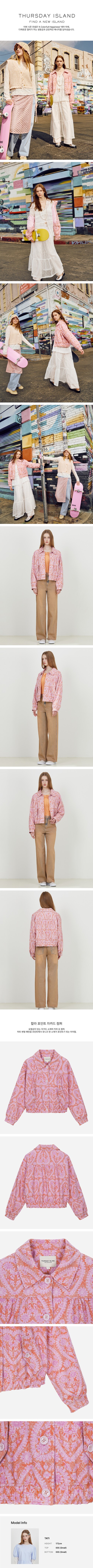 요철감이 있는 자가드 소재의 카라 숏 점퍼.하트 변형 패턴을 프린트해서 유니크한 소재가 포인트가 되는 아이템.