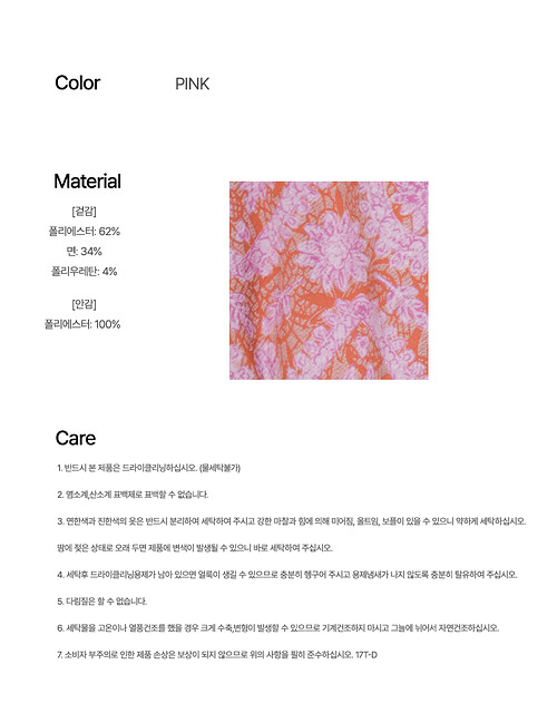 핑크 : 겉감 폴리에스터62%, 면34%, 폴리우레탄4%, 안감 폴리에스터100% - 세탁방법 및 취급시 주의사항 다림질금지, 드라이크리닝, 물세탁금지