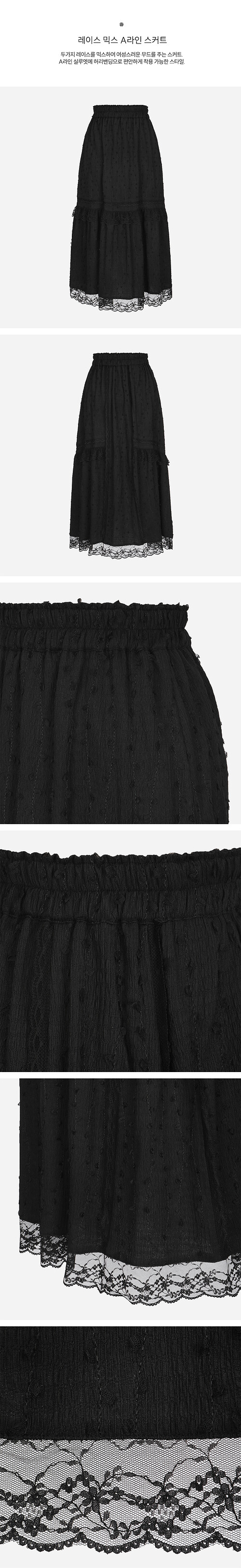 두가지 레이스를 믹스하여 여성스러운 무드를 주는 스커트.A라인 실루엣에 허리밴딩으로 편안하게 착용 가능한 스타일.