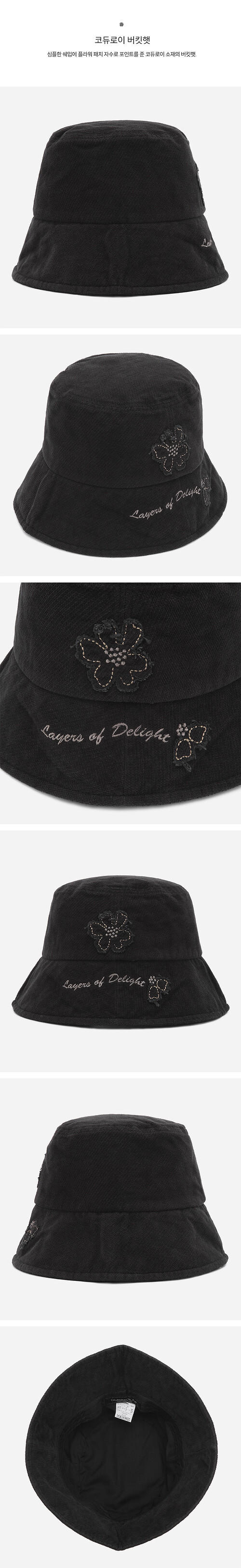 심플한 쉐입에 플라워 패치 자수로 포인트를 준 코듀로이 소재의 버킷햇.