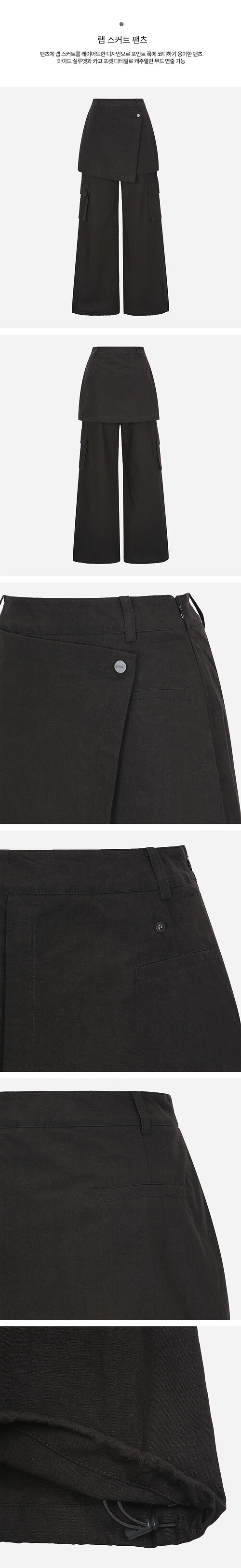 팬츠에 랩 스커트를 레이어드한 디자인으로 포인트 룩에 코디하기 용이한 팬츠.와이드 실루엣과 카고 포켓 디테일로 캐주얼한 무드 연출 가능.
