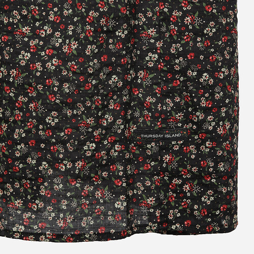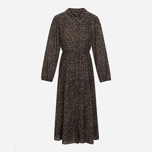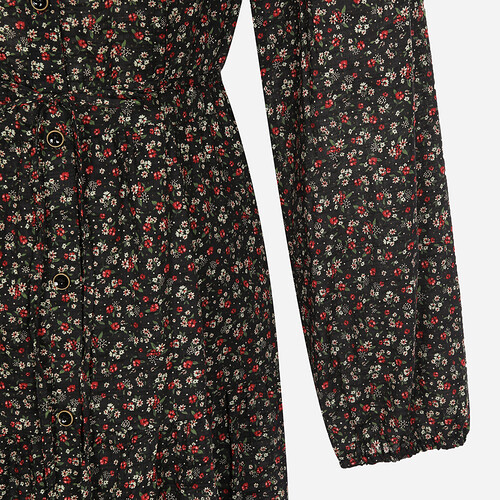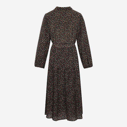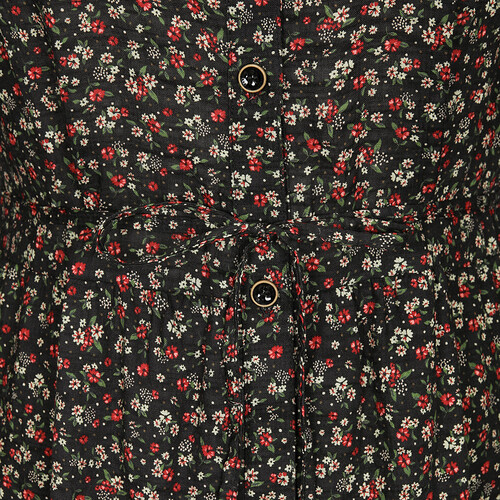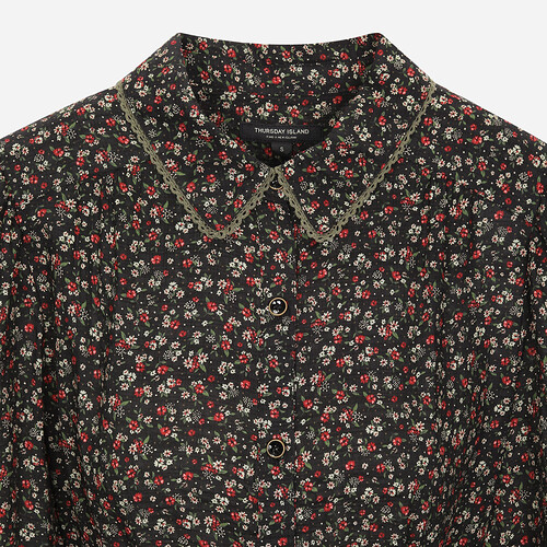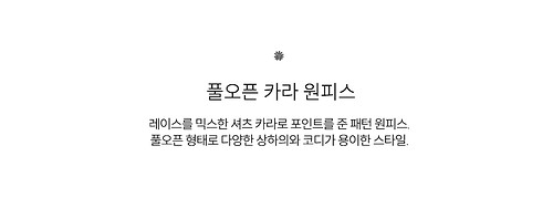 레이스를 믹스한 셔츠 카라로 포인트를 준 패턴 원피스.풀오픈 형태로 다양한 상하의와 코디가 용이한 스타일.