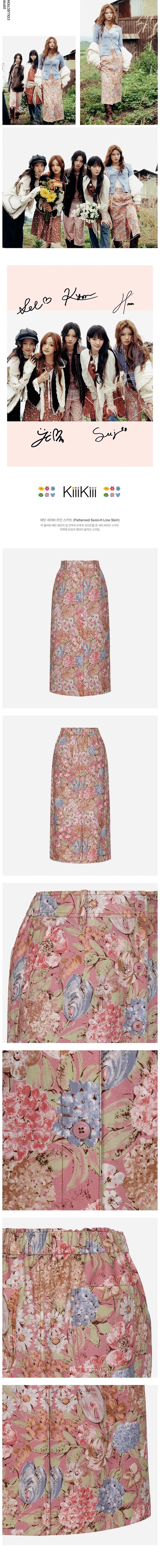 빅 플라워 패턴 원단과 앞 단작의 단추로 포인트를 준 세미 H라인의 스커트.뒤쪽에 트임과 밴딩이 들어가 있는 스타일.