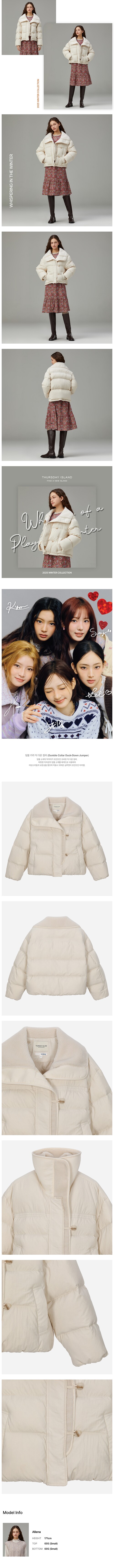 덤블 소재의 빅카라가 포인트인 오버핏 덕 다운 점퍼.따뜻한 터치감의 덤블 소재를 배색으로 사용하여 여성스러움과 보온성을 했으며 착용시 귀여운 실루엣이 포인트인 아이템.