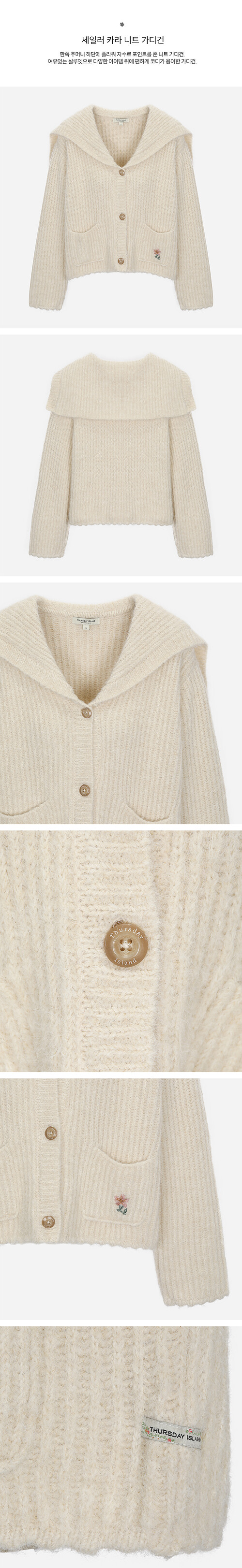 한쪽 주머니 하단에 플라워 자수로 포인트를 준 니트 가디건.여유있는 실루엣으로 다양한 아이템 위에 편하게 코디가 용이한 가디건.