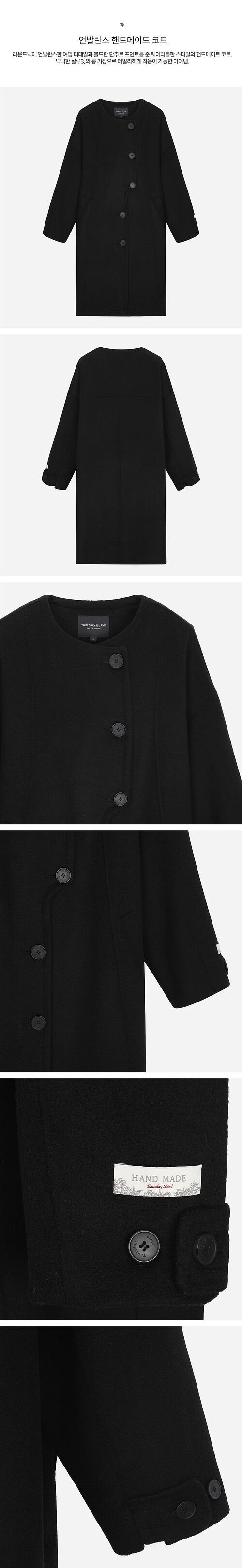 라운드넥에 언발란스한 여밈 디테일과 볼드한 단추로 포인트를 준 웨어러블한 스타일의 핸드메이트 코트.넉넉한 실루엣의 롱 기장으로 데일리하게 착용이 가능한 아이템.