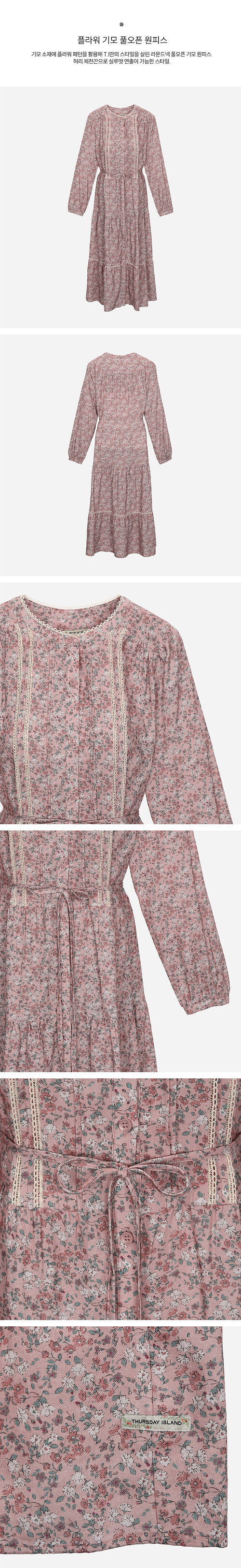 기모 소재에 플라워 패턴을 활용해 T.I만의 스타일을 살린 라운드넥 풀오픈 기모 원피스.허리 제천끈으로 실루엣 연출이 가능한 스타일.