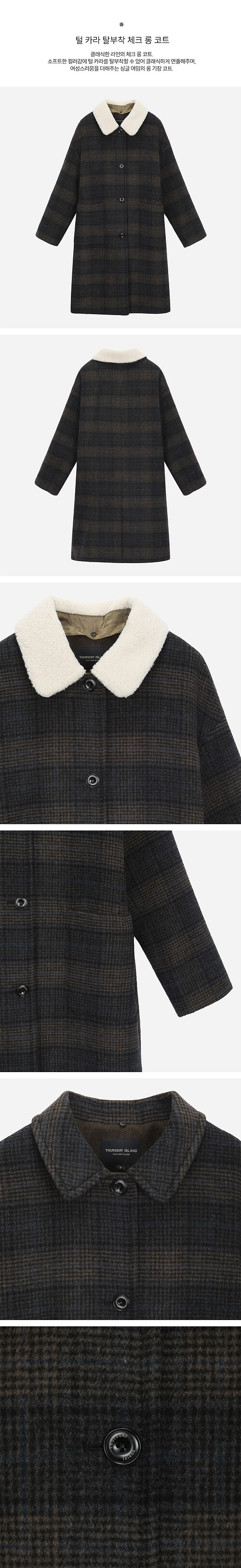 클래식한 라인의 체크 롱 코트.소프트한 컬러감에 털 카라를 탈부착할 수 있어 클래식하게 연출해주며,여성스러움을 더해주는 싱글 여밈의 롱 기장 코트.