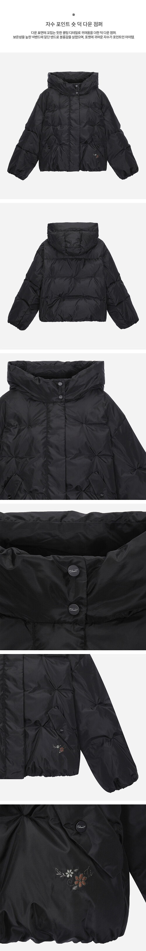 다운 표면에 꼬집는 듯한 퀼팅 디테일로 귀여움을 더한 덕 다운 점퍼.보온성을 높힌 넥밴드에 밑단 밴드로 볼륨감을 살렸으며,포켓에 귀여운 자수가