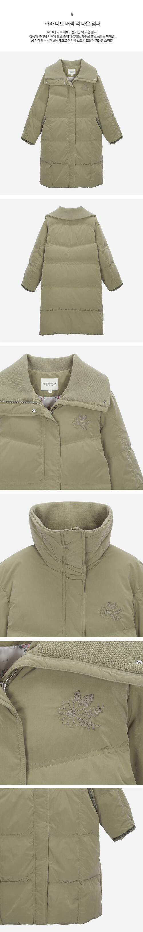 네크에 니트 배색이 들어간 덕 다운 점퍼.상동의 플라워 자수와 포켓,소매에 접밴드 자수로 포인트를 준 아이템.롱 기장의 넉넉한 실루엣으로 허리쪽