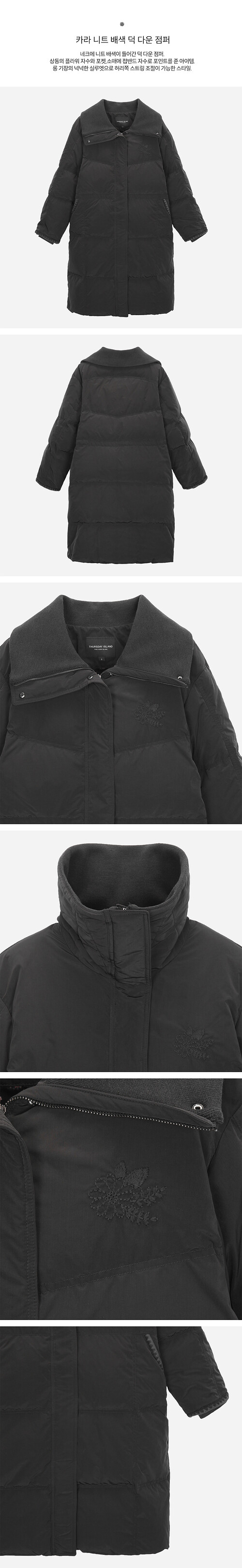 네크에 니트 배색이 들어간 덕 다운 점퍼.상동의 플라워 자수와 포켓,소매에 접밴드 자수로 포인트를 준 아이템.롱 기장의 넉넉한 실루엣으로 허리쪽