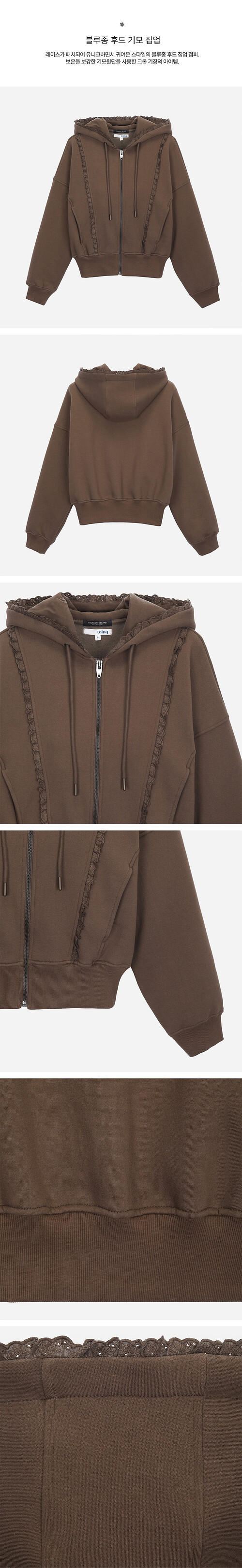 레이스가 패치되어 유니크하면서 귀여운 스타일의 블루종 후드 집업 점퍼. 보온을 보강한 기모원단을 사용한 크롭 기장의 아이템.